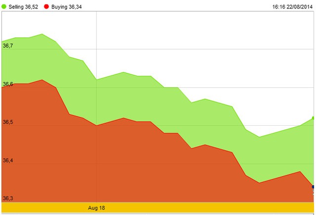 Tại thị trường trong nước, giá vàng SJC hôm nay có diễn biến khá bất thường về cuối buổi chiều. Cụ thể, từ khoảng 4h chiều, giá đột ngột tăng ở giá bán thêm 20.000 đồng/lượng, nhưng lại giảm giá mua 40.000 đồng/lượng, khiến khoảng cách giữa giá mua và giá bán doãng ra 180.000 đồng/lượng với giá 36,34 - 36,52. Với giá này, giá tăng 30.000 đồng/lượng ở giá bán, song lại giảm 30.000 đồng/lượng ở giá mua so với chiều qua.