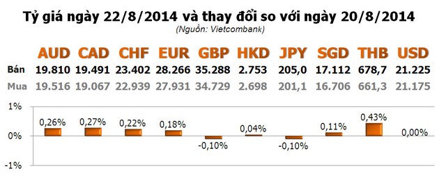 Các ngoại tệ khác hầu hết tăng trở lại. Trong đó, tăng mạnh nhất là THB với 0,43%; tiếp đến là CAD với 0,27%; và AUD với 0,26%...