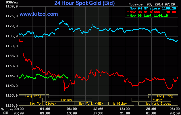 Giá vàng giao tháng 12 kết thúc phiên ngày 5/11 ở mức 1.145,1 USD/ounce, giảm 22,6 USD/ounce so với ngày trước đó. Giá vàng giao ngay chốt ngày giảm 2,3 USD xuống còn 1.145,75 USD/ounce.