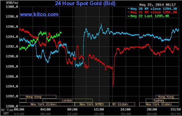 Hôm nay, 22/5, giá vàng dao động dưới ngưỡng 1.300 USD/ounce sau khi Fed nói rằng, Ngân hàng đang nhận thấy ít rủi ro lạm phát và tài sản của quỹ tín thác vàng lớn nhất thế giới SPDR Gold Trust giảm xuống mức thấp nhất kể từ tháng 12/2008, còn 776,89 tấn trong ngày hôm qua.