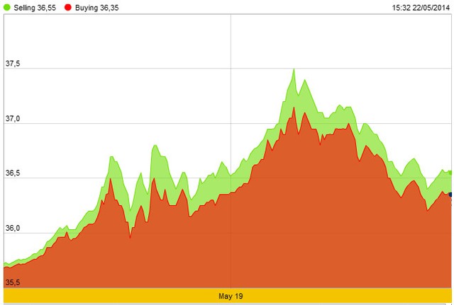 Tại thị trường trong nước, giá vàng SJC sau khi đạt đỉnh 37,15 - 37,50 triệu đồng/lượng trong ngày 20/5 đã giảm trở lại trong hai ngày qua. Đến 4h40 chiều 22/5, giá vàng thương hiệu quốc gia còn 36,37 - 36,57 triệu đồng/lượng, tức giảm gần 1 triệu đồng/lượng so với mức đỉnh của hai ngày trước đó. Tuy nhiên, giá này vẫn cao hơn 3 triệu đồng/lượng so với giá vàng thế giới quy đổi.
