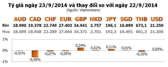 Với các ngoại tệ khác, ngoại trừ CAD giảm 0,58% và GBP tăng 0,24%, còn lại biến động không đáng kể.