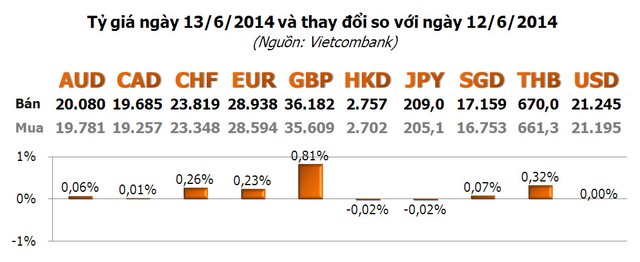 Các ngoại tệ khác hầu hết vẫn tăng, trong đó GBP tăng mạnh nhất với 0,81%; tiếp đến là THB với 0,32%; CHF với 0,26%...