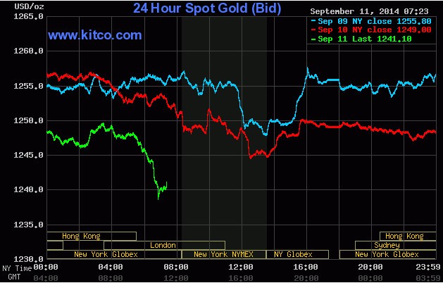 Chốt ngày 10/9 trên thị trường Mỹ, giá vàng giao tháng 12 giảm 1,9 USD/ounce xuống còn 1.246,6 USD/ounce. Giá vàng giao ngay giảm 10 USD/ounce còn 1.246,25 USD/ounce.
