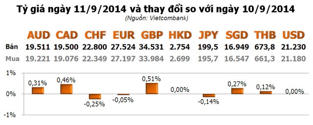 Các ngoại tệ khác phần lớn tăng. Trong đó, GBP mạnh nhất với 0,51%; tiếp đến là CAD với 0,46%; AUD với 0,31%... Trong chiều giảm, CHF dẫn đầu với -0,25%.
