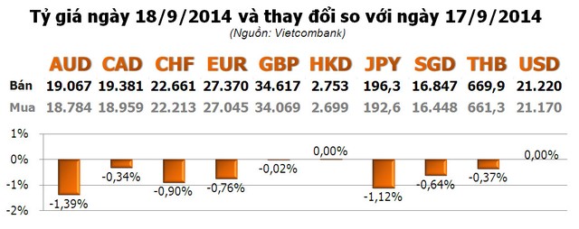 Với các ngoại tệ khác, hầu hết giảm. Trong đó, giảm mạnh nhất là AUD với -1,39%; tiếp đến là JPY với -1,12%; CHF với -0,90%; EUR với -0,76%...
