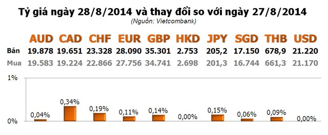 Các ngoại tệ khác toàn bộ tăng, trong đó, CAD là đồng tiền tăng mạnh nhất với 0,34%; tiếp đến là CHF với 0,19%; JPY với 0,15%...