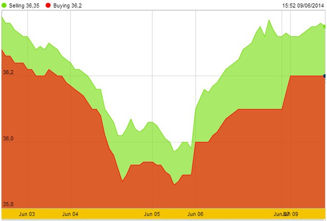 Trên thị trường ngoại tệ, giá USD do Vietcombank niêm yết hôm nay tăng mạnh 30 đồng/USD so với cuối tuần trước lên 21.190 - 21.240 đồng/USD. Tuần trước giá USD đã giảm mạnh từ mức trần 21.246 xuống còn 21.160 - 21.210 đồng/USD.