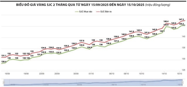 Cùng đà tăng của vàng thế giới, giá vàng trong nước cũng liên tục lập đỉnh tại các thương hiệu lớn. Chẳng hạn, vào ngày 15/10, giá vàng SJC bán ra ở mức 147,3 triệu đồng/lượng, mua vào 145,3 triệu đồng/lượng, lần lượt tăng 12,4% và 13% chỉ trong một tháng, đem lại lợi nhuận hấp dẫn cho người mua vàng.