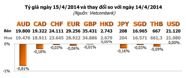 Với các ngoại tệ khác, hầu hết giảm, trong đó AUD giảm mạnh hơn hẳn với -0,81%. Các ngoại tệ còn lại giảm từ 0,18% trở xuống.