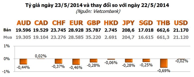 Các ngoại tệ khác đồng loạt giảm do USD tăng giá trên thị trường quốc tế, mạnh nhất là THB với -0,69%; tiếp đến là EUR với -0,46%; AUD với -0,44%...