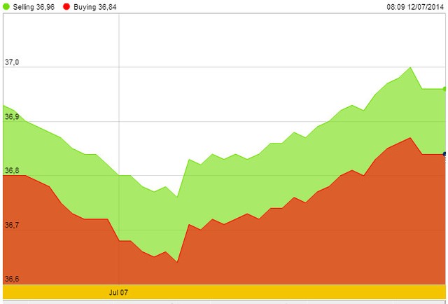 Tại thị trường trong nước, giá vàng SJC cũng có một tuần tăng giá như giá vàng thế giới, mặc dù giảm ở các phiên đầu và cuối tuần. Chốt tuần qua, giá vàng thương hiệu quốc gia ở mức 36,84 - 36,96 triệu đồng/lượng, tăng 120.000 đồng/lượng ở giá mua, 140.000 đồng/lượng ở giá bán so với cuối tuần trước đó. Trong tuần, giá bán ra vàng SJC đã có lúc đạt 37 triệu đồng/lượng vào ngày 10/7, cao nhất kể từ 21/6.