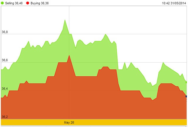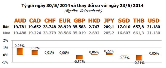Giá USD do Vietcombank niêm yết tăng đến 21.145 - 21.195 đồng/USD vào ngày 29/5, cao nhất kể từ ngày 27/8/2013. Tuy nhiên, giá đã giảm trở lại 15 đồng/USD vào ngày cuối tuần, còn 21.130 - 21.180 đồng/USD.