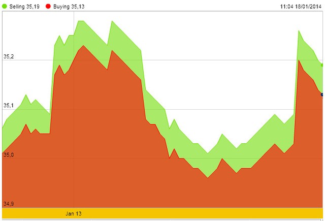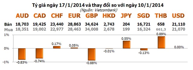 Trên thị trường ngân hàng, giá USD do Vietcombank niêm yết chỉ tăng nhẹ 5 đồng vào hai ngày 15 và 16/1 trước khi giảm trở lại đúng mức này vào ngày cuối tuần, còn 21.070 - 21.110 đồng/USD. Đây cũng là mức giá chốt của tuần trước đó.