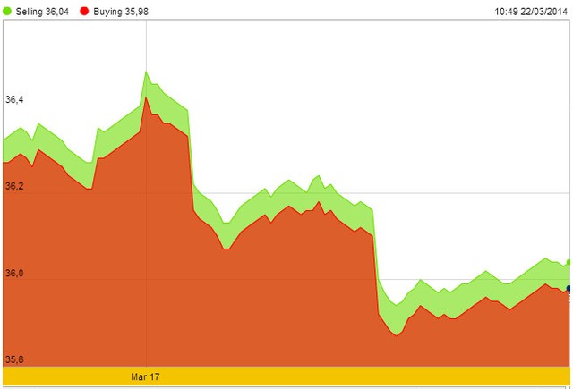 Tỷ giá hối đoái ngày 21/3/2014 và thay đổi so với ngày 14/3/2014 (Nguồn: Vietcombank)