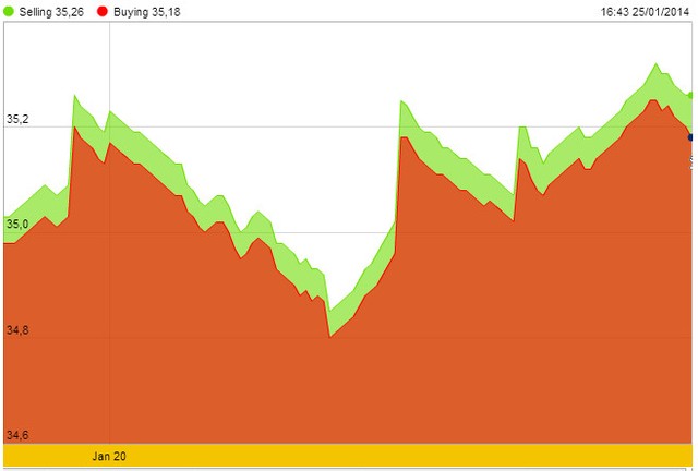 Tuần qua, giá USD trên cả hai thị trường có xu hướng giảm, đặc biệt trên thị trường ngân hàng. Đặc biệt, ngay cả trong ngày thứ Bảy, 25/1, ngày mà Vietinbank thường không điều chỉnh tỷ giá niêm yết, Ngân hàng cũng giảm giá USD 10 đồng xuống còn 21.055 - 21.095 đồng/USD, thấp hơn 15 đồng/USD so với cuối tuần trước đó.