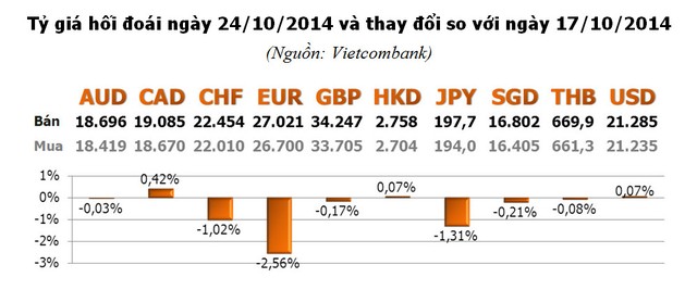 Các ngoại tệ khác hầu hết giảm. Trong đó, giám mạnh nhất là EUR của châu Âu với -2,56%, bỏ xa đồng tiền giảm thứ hai là JPY của Nhật với -1,31%; tiếp đến là CHF của Thụy Sỹ với -1,02%... Ở chiều tăng, chỉ có CAD của Canada đáng kể với 0,42%.