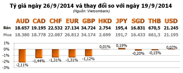 Với các ngoại tệ khác, các đồng tiền phương Tây đồng loạt giảm mạnh, trong khi các đồng tiền châu Á gần như không đổi. Giảm mạnh nhất là AUD với -2,11%; tiếp theo là CAD với -1,44%; EUR và CHF với cùng -1,31%...
