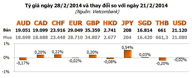 Giá USD tự do giảm liên tiếp trong 3 ngày đầu tuần, mỗi ngày 5 đồng ở giá mua, 10 đồng ở giá bán xuống còn 21.110 - 21.130 đồng/USD vào ngày 26/2. Sau đó, giá tăng lại 10 đồng trước khi giảm 5 đồng ở giá bán trong ngày cuối tuần, chốt tại 21.120 - 21.135 đồng/USD.
