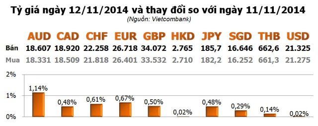 Các ngoại tệ khác đều tăng, trong đó, tăng mạnh nhất là AUD với 1,14%; EUR với 0,67%; CHF với 0,61%.