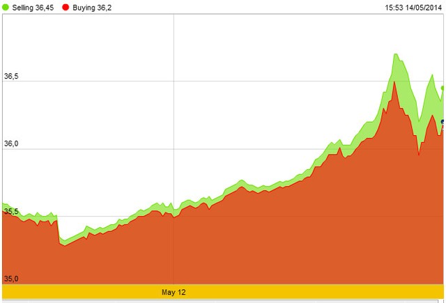Tại thị trường trong nước, giá vàng SJC hôm nay bất ngờ tăng mạnh, đến 5h16 chiều nay, giá vàng thương hiệu quốc gia ở mức 36,20 - 36,45 triệu đồng/lượng, tăng 750.000 đồng/lượng ở giá bán, 450.000 đồng/lượng ở giá mua so với chiều qua. Mức cao nhất đạt được trong ngày là 36,50 - 36,70 triệu đồng/lượng.
