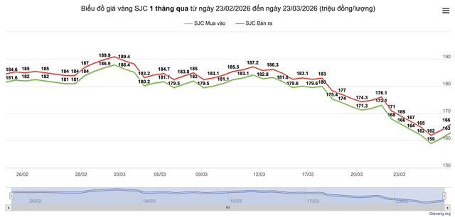 Trong nước, đến 16h30 ngày 23/03, giá vàng miếng và vàng nhẫn SJC dao động quanh mức 162,8 - 166 triệu đồng/lượng (mua vào - bán ra), phục hồi nhẹ so với đáy 162 triệu đồng/lượng (bán ra) ghi nhận vào đầu giờ chiều cùng ngày. Dù vậy, so với vùng đỉnh khoảng 191 triệu đồng/lượng, giá vàng đã “bốc hơi” khoảng 25 triệu đồng, tương đương mức giảm hơn 13% chỉ trong chưa đầy 3 tuần. Mức giảm này khiến nhiều nhà đầu tư mua ở vùng giá cao nhanh chóng rơi vào trạng thái thua lỗ.