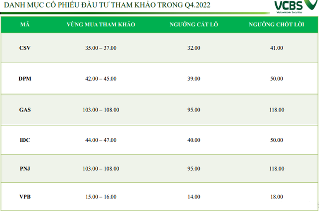 Trong bối cảnh hiện tại, VCBS cho rằng, VN-Index gần như không thể quay lại được mức cao nhất đã đạt được vào tháng 4/2022. Hiện tại, vùng 950 - 1.000 điểm vẫn đang là vùng điểm số hỗ trợ gần nhất của thị trường và VCBS không kỳ vọng khả năng VN-Index rơi xuống dưới mức này mà cho rằng chỉ số sẽ dao động trong vùng 1.000 – 1.200 điểm trong quý IV.