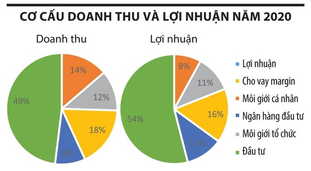 Về cơ cấu doanh thu trong kỳ, mảng môi giới ghi nhận 162 tỷ đồng, tăng 81% so với cùng kỳ năm trước và lợi nhuận trước thuế đạt 97 tỷ đồng, tăng 100%. Hoạt động giao dịch của khách hàng trong nước tiếp tục duy trì sự sôi động trong quý IV/2020, giúp doanh thu môi giới từ nhóm khách hàng này tăng 114%. Hoạt động giao dịch của nhà đầu tư nước ngoài cũng được cải thiện, hỗ trợ mức tăng 41% trong doanh thu môi giới tổ chức của VCSC.