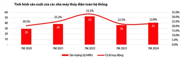 Đối với thuỷ điện, trong 7 tháng đầu năm 2024, sản lượng trên toàn hệ thống tăng trưởng 13,7%, lên 41 tỷ kWh và tỷ lệ huy động từ nguồn thủy điện bắt đầu cao hơn so với 7 tháng 2023 do chu kỳ El Nino đã đi qua, trái ngược với diễn biến nửa đầu năm nay.