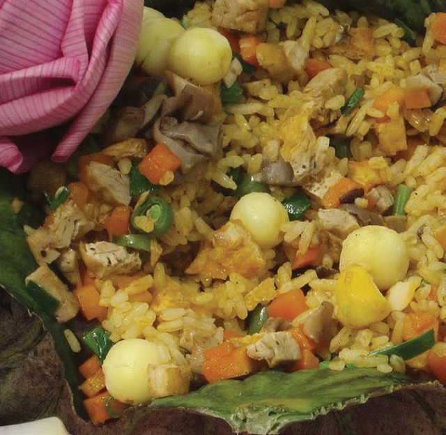 Nhìn vào món cơm hấp lá sen, ta có thể mường tượng như đang được thưởng thức một “bông hoa” ẩm thực. Món ăn này có “nhụy” rất thơm ngon với hỗn hợp cơm, hạt sen, tai nấm đông cô, củ cải, cà rốt, khuôn đậu...