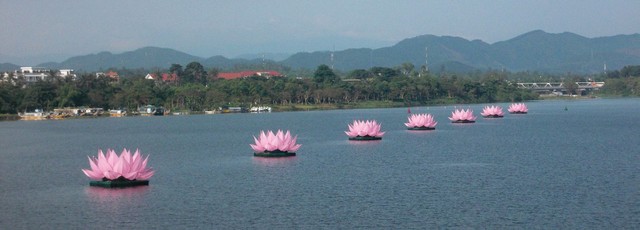 Bảy đóa sen khổng lồ trên sông Hương tượng trưng cho bảy bước đi thanh tịnh của Đức Phật. Ảnh: Nguyễn Văn Toàn