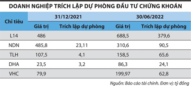 Thống kê 5 doanh nghiệp sản xuất có hoạt động đầu tư chứng khoán trên sàn, gồm Công ty cổ phần Licogi 14 (mã L14), Công ty cổ phần Nhà Đà Nẵng (mã NDN), Công ty cổ phần Thép Tiến Lên (mã TLH), Công ty cổ phần Hóa An (mã DHA), Công ty cổ phần Vĩnh Hoàn (mã VHC) với tổng danh mục ước tính 1.443,9 tỷ đồng, có thể thấy, các doanh nghiệp này đã trích lập dự phòng giảm giá chứng khoán lên tới 622,6 tỷ đồng, bằng 43,1% tổng danh mục.
