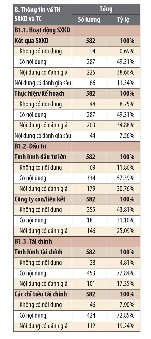 Đối với phần B: Thông tin về sản xuất kinh doanh và tài chính. Phần này được chia làm 3 phần nhỏ để đánh giá mức độ truyền tải thông tin của BCTN, là B1: tình hình hoạt động trong năm của công ty; B2: báo cáo và đánh giá của Ban giám đốc và B3: báo cáo tài chính. Tuy phần B có trọng số điểm cao nhất, nhưng điểm trung bình lại khá thấp, đạt 25/42,5 điểm. Các BCTN thường có điểm thấp ở mục B1 (điểm trung bình = 53% tổng điểm mục này) và điểm cao ở mục B3 (điểm trung bình = 89% tổng điểm mục này).