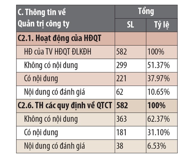 Khi xem xét phần C2.1 về hoạt động của HĐQT, có đến hơn nửa BCTN không có nội dung liên quan đến hoạt động của thành viên HĐQT độc lập không điều hành hoặc có khi không nêu thành viên nào là thành viên HĐQT độc lập không điều hành. Bên cạnh đó, nội dung C2.6 về thực hiện các quy định quản trị công ty, các BCTN hoặc không nêu nội dung này hoặc chỉ nêu ngắn gọn một dòng là đã thực hiện đúng các quy định về quản trị công ty, không có nội dung chưa thực hiện và phương án khắc phục.