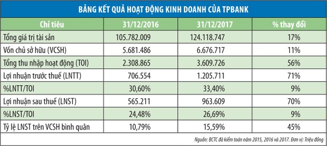 Theo đó, tổng thu nhập hoạt đồng thuần năm 2017 của TPBank đạt 3.609 tỷ đồng, trong đó thu nhập lãi thuần chiếm tỷ trọng cao nhất 88%, tương đương với 3.172 tỷ đồng. Thu nhập thuần ngoài lãi đạt 437 tỷ đồng, chiếm 12%. Lợi nhuận trước dự phòng rủi ro tín dụng đạt 1.668 tỷ đồng (năm 2017 trích lập 462 tỷ đồng). Nhờ việc đa dạng hóa các sản phẩm, dịch vụ cung cấp, đồng thời tăng cường tập trung vào phân khúc có tỷ lệ lãi cao, nâng cao chất lượng tài sản và hiệu quả trong việc huy động vốn và sử dụng nguồn vốn, giúp cho tổng thu nhập hoạt động thuần của TPBank tăng nhanh.