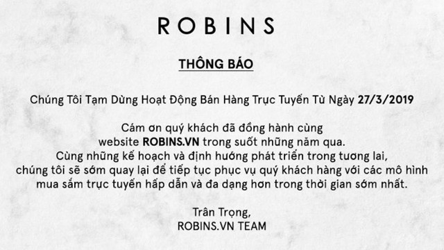Nguồn tin của Zing.vn cho hay quyết định đóng cửa Robins Online được lãnh đạo của Central Group Việt Nam thông báo với nội bộ từ tháng 2. Thời điểm này, nhân viên của Robins Online bắt đầu nhận email về việc sàn thương mại điện tử này sẽ dừng hoạt động mua bán.