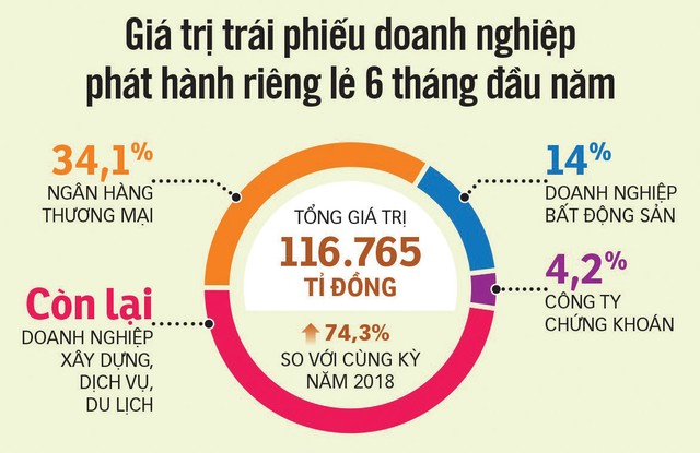 Theo thống kê của Hiệp hội Thị trường trái phiếu Việt Nam (VBMA), riêng tháng 7/2019, lượng trái phiếu doanh nghiệp hút tới 6.764 tỷ đồng và 300 triệu USD; con số này của 6 tháng đầu năm là trên 116.000 tỷ đồng, tăng 74% so với cùng kỳ.
