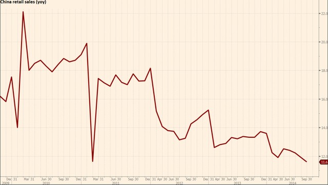 Đầu tiên, sản lượng công nghiệp của Trung Quốc chỉ cao hơn mức thấp của 5 năm. Điều này phản ánh thực trạng yếu ớt của nền kinh tế toàn cầu, đặc biệt là châu Âu, trong khi các doanh nghiệp Trung Quốc như các công ty thép và các doanh nghiệp xi măng đang chật vật với thị trường nhà ở sụt giảm sau nhiều năm điên cuồng đầu tư bất động sản. Tuy nhiên, tăng trưởng sản lượng công nghiệp đã hồi về mức 8% trong tháng 9, và điều này có thể ngăn Chủ tịch Tập Cận Bình không đưa ra thêm các biện pháp kích thích kinh tế.