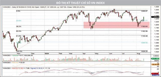 Sự lan tỏa của dòng tiền đến hầu hết các nhóm ngành, với sức mạnh vượt trội thể hiện trên nhóm cổ phiếu bất động sản, chứng khoán khi có nhiều cổ phiếu tăng trần và mở ra một phiên bùng nổ theo đà (FTD) sau 9 phiên hồi phục kể từ ngày 5/8/2024 đầy đủ về cả về chất và lượng. Cây nến tăng điểm xanh đặc cuối tuần đã bao trùm 90% cây nến giảm điểm ngày 1/8, cho thấy áp lực cung được hấp thụ tốt và nhà đầu tư chấp nhận trả giá cao hơn để sở hữu cổ phiếu. Theo đó, xu hướng tăng trở lại đang được ủng hộ, VN-Index tiến tới ngưỡng cản gần nhất quanh mốc 1.260 điểm (MA50, MA100).