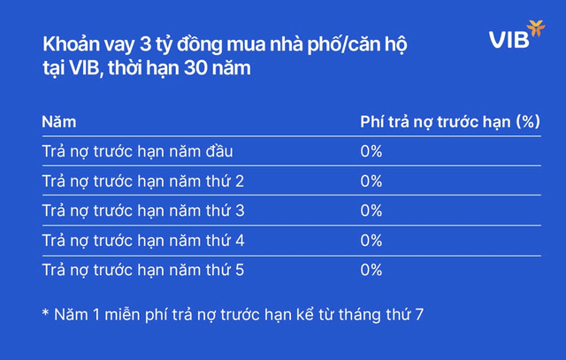 Bên cạnh phương thức trả gốc linh hoạt bậc nhất thị trường, các gói vay mua nhà phố, căn hộ chung cư của VIB mang đến đa dạng lựa chọn về lãi suất với các mức lãi suất 5,9 - 6,9 - 7,9%/năm cố định trong 6, 12 và 24 tháng đầu. Ngoài ra, khách hàng đang có khoản vay mua nhà tại ngân hàng khác sẽ được giảm thêm 0,4% lãi suất khi chuyển khoản vay về VIB và được hỗ trợ giải ngân trước để tất toán khoản vay tại ngân hàng cũ.