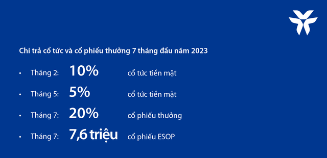 Hiện tại, VIB đã hoàn tất chi trả cổ tức 35% bao gồm 15% cổ tức tiền mặt và 20% bằng cổ phiếu theo kế hoạch đã được thông qua tại Đại hội đồng cổ đông trong quý 1. Bên cạnh đó, VIB cũng đã hoàn tất các thủ tục pháp lý để thực hiện phân phối 7,6 triệu cổ phiếu thưởng ESOP đến cán bộ nhân viên.