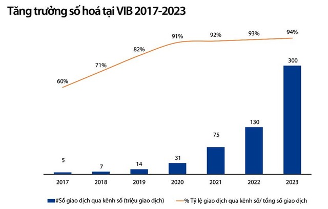 Cùng với mục tiêu trở thành Ngân hàng sáng tạo nhất Việt Nam, VIB đang triển khai chiến lược số hóa dài hạn với Ngân hàng số chứng kiến sự tăng trưởng mạnh mẽ cùng tỷ lệ thâm nhập và chuyển đổi số cao. Trong giai đoạn 2017-2023, tốc độ tăng trưởng giao dịch số đạt 100% với hơn 300 triệu giao dịch số thực hiện trong năm 2023. Trong đó, với hơn 94% giao dịch bán lẻ được thực hiện trên kênh số và hàng triệu khách hàng sử dụng dịch vụ ngân hàng số thường xuyên mỗi tháng.