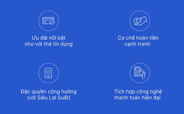 Đặc quyền tương đương thẻ tín dụng: Mức hoàn tiền thuộc top đầu thị trường lên đến 5%, quyền lợi phòng chờ sân bay và các ưu đãi cao cấp khác mà không cần chứng minh thu nhập hay chờ đợi phê duyệt tín dụng.