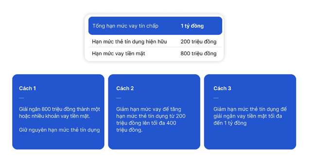 Với Super Cash, người dùng sẽ được cấp một hạn mức tín dụng tối đa tới 1 tỷ đồng bao gồm thẻ tín dụng và khoản vay tiền mặt. Tùy theo nhu cầu sử dụng, người dùng có thể luân chuyển hạn mức từ thẻ sang tiền mặt hoặc ngược lại khi cần vốn nhanh mà không cần mở khoản vay mới.