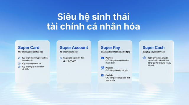 Cùng với SuperCard và SuperAccount, “bộ tứ Super” tạo thành một siêu hệ sinh thái đồng nhất, nơi mỗi sản phẩm đều đóng vai trò như một mắt xích quyền năng giúp khách hàng làm chủ dòng tiền, tối ưu hóa đòn bẩy tài chính và hiện thực hóa mục tiêu cá nhân một cách thông minh, hiệu quả.
