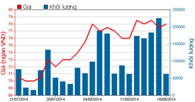Biểu đồ giá, khối lượng giao dịch của mã VIC trong 1 tháng qua. Nguồn: HOSE