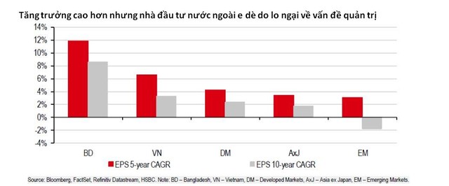 Thị trường chứng khoán Việt Nam được HSBC cho rằng, nhìn chung tạo ra tăng trưởng lợi nhuận cao hơn hầu hết các thị trường phát triển và mới nổi; tuy nhiên, các nhà đầu tư thường e dè do những lo ngại liên quan đến các báo cáo tài chính dưới chuẩn và những gì họ nhìn nhận là các quy định mâu thuẫn, một rủi ro đầu tư thường liên quan đến các thị trường cận biên.