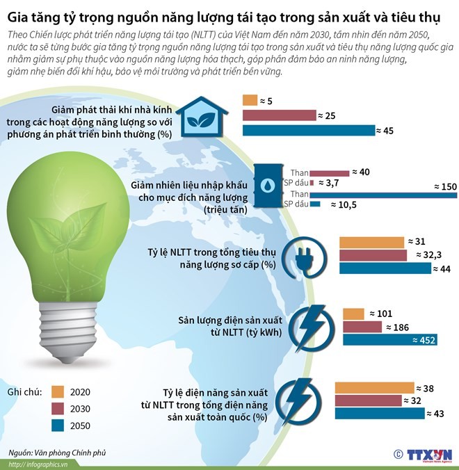 Theo Chiến lược phát triển năng lượng tái tạo của Việt Nam đến năm 2030, tầm nhìn đến năm 2050, Việt Nam sẽ từng bước gia tăng tỷ trọng nguồn năng lượng tái tạo trong sản xuất và tiêu thụ năng lượng quốc gia nhằm giảm sự phụ thuộc vào nguồn năng lượng hóa thạch, góp phần đảm bảo an ninh năng lượng, giảm nhẹ biến đổi khí hậu, bảo vệ môi trường và phát triển bền vững.