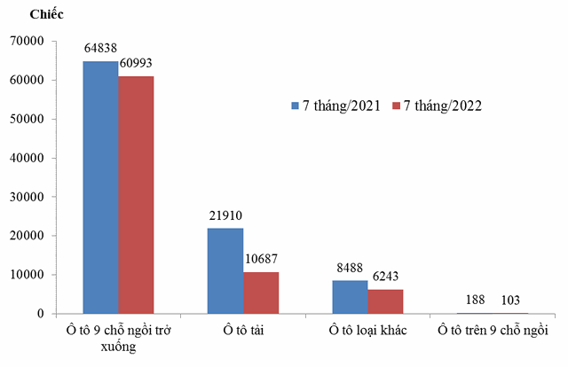 Tính chung lũy kế 7 tháng năm 2022, lượng ô tô nguyên chiếc các loại nhập khẩu về Việt Nam là 78.026 chiếc, giảm 18,2% so với cùng kỳ năm trước; trong đó, ô tô 9 chỗ ngồi trở xuống là 60.993 chiếc, giảm 5,9%; ô tô vận tải là 10.687 chiếc, giảm mạnh tới 51%...