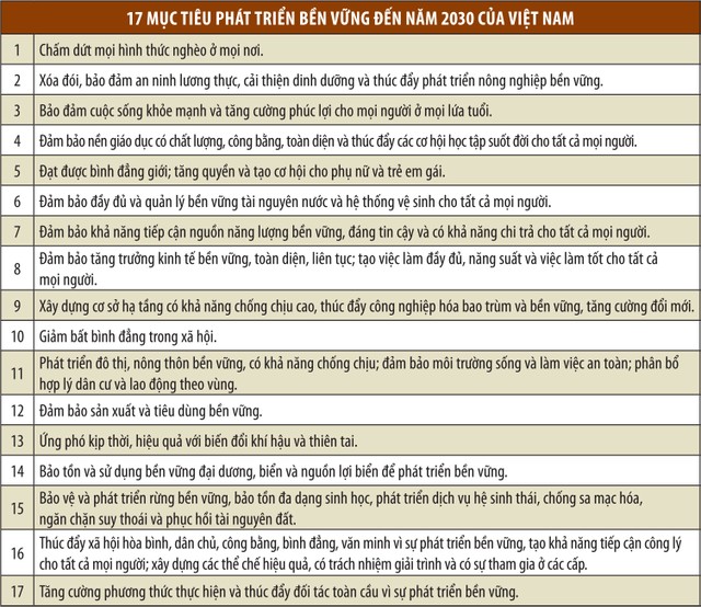 Trong bối cảnh cuộc chiến chống biến đổi khí hậu cam go, căng thẳng, Liên hợp quốc đã đưa ra Chương trình nghị sự 2030, gồm 17 mục tiêu chung và 169 mục tiêu cụ thể về phát triển bền vững. Các mục tiêu trong Chương trình nghị sự 2030 được xem như là định hướng mang tính toàn cầu và mỗi quốc gia cần phải đặt ra các mục tiêu phù hợp với bối cảnh của quốc gia để thực hiện.